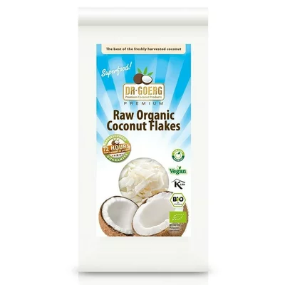 Fulgi de cocos bio, cruzi (raw). Garantia prospetimii Dr. Goerg: produsul este realizat in maxim 72 de ore de la recoltarea nucilor de cocos!