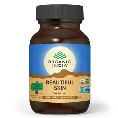 ORGANIC INDIA Beautiful Skin, Ten Radiant este un produs ce contine plante cultivate sustenabil fara pesticide si plante 100% Certificate Organic si nu contine organisme modificate genetic. .